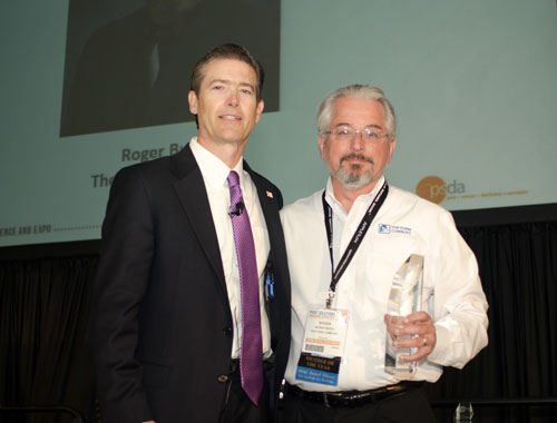 The Flesh Company, St. Louis, MO, announced that Roger D. Buck, CDC, Marketing Director, was awarded the PSDA Member of the Year Award at the recent 2012 Print Solutions Conference in Baltimore, MD. The award is presented to the PSDA member who has made the most outstanding contribution to the progress of the PSDA. In a letter from the Executive Vice President, Matt Sanderson, he writes “Over the past year, you have repeatedly dedicated time and energy to the PSDA’s efforts to improve our programming and to raise our profile within the greater print and marketing landscape.” PSDA outgoing President Bill Prettyman presented the award to Buck during the PEAK Awards ceremonies.